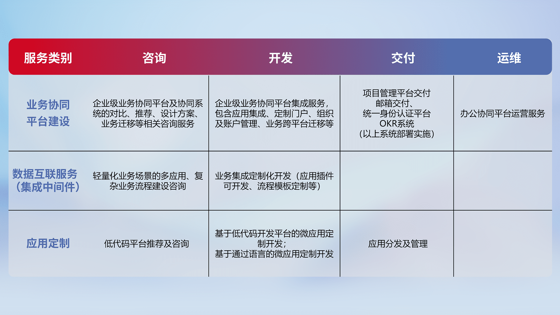 基于全代码低代码的数字化应用系统开发及交付,,,,满足特定业务场景的应用开发及集成,,,提升企业业务信息化及数字化能力。。。